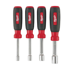 Milwaukee® Nut Driver Set, Measurement System: Imperial, 4 Piece, 1/4 to 9/16 in Size, 6 in Overall Length, Cushion Grip Handle, Magnetized Tip: No, Polished Chrome, Specifications: 3 in L Shank, Steel, Black/Red