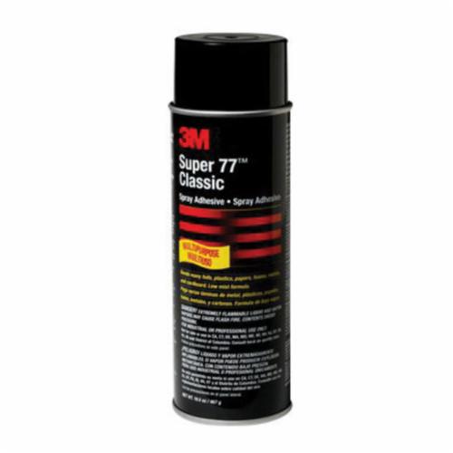 3M™ Super 77™ Spray Adhesive, Multi-Purpose, Series: Classic, Aerosol Can Container, 24 fl-oz Container, 16.5 oz Net Weight, 1 to 30 min Setting, 30 min Curing, Clear, 150 deg F, 0.69 Specific Gravity, 0.84 VOC, Flammability: 4, EPDM Rubber, Fabric, Felt, Cork and Fibrous Glass, Latex, Urethane, Glass and Ceramic, Leather, Metal, Paper and Cardboard, ABS, PVC, Acrylic, Flexible Vinyl, High Performance Nylon, Polyolefin and Thermoplastic Elastomer, Wood and Hardboard Adheres to
