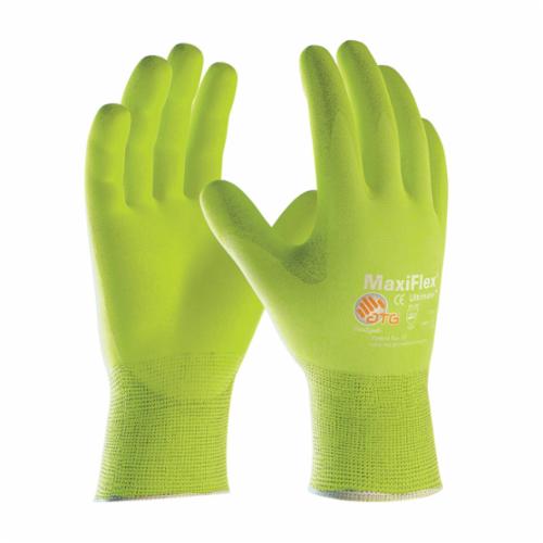 ATG® MaxiFlex® Ultimate™ 34-874FY/M General Purpose Gloves, Coated, M, Microfoam Nitrile Palm, Nylon, Hi-Viz Yellow, Continuous Knit Wrist Cuff, Microfoam Nitrile Coating, Resists: Abrasion, Cut, Puncture and Tear, Nylon/Lycra® Lining