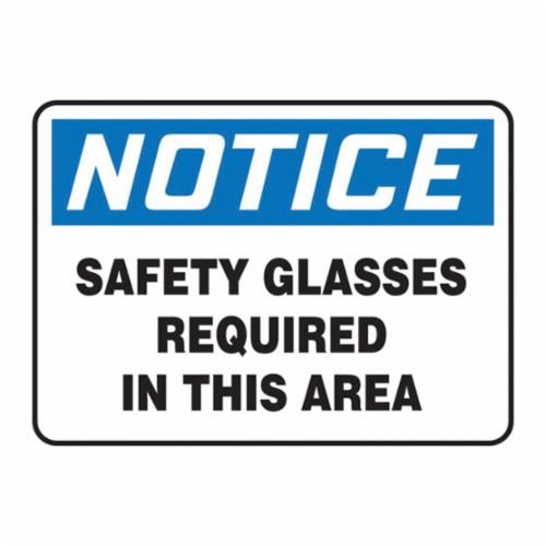 Accuform® Notice Sign, Moisture-Resistant, Header: NOTICE, Text Legend, SAFETY GLASSES REQUIRED IN THIS AREA Legend, Adhesive Vinyl, Surface Mount, 7 in Height, 10 in Width, Black/Blue on White