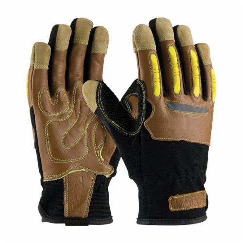 PIP® 120-4100/L Men's General Purpose Gloves, Leather Palm/Work, Full Finger/Reinforced Thumb Crotch Style, L, Split Goatskin Leather Palm, Kevlar®/Lycra®/Leather/Spandex®, Black/Brown, Hook and Loop Wrist Cuff, Uncoated Coating, Kevlar® Lining